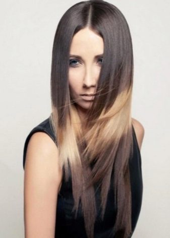 To je reverzní ombre, který zahrnuje velmi bílé prameny na vrcholu a zbarvení konců kadeří v tmavších odstínech. Pro blondýnky v platinových a popelových tónech používají kombinaci se světle hnědou, ale pro ženy se zlatými vlasy je kombinace s hnědými a čokoládovými odstíny optimální.