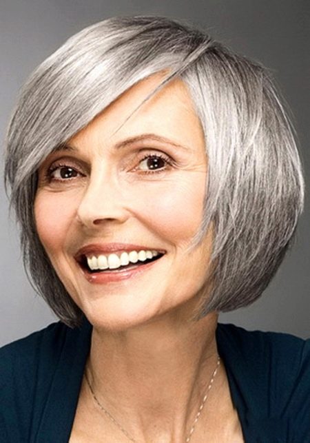 - Reverzní ombre a krátký střih na přírodní šedé vlasy.