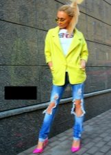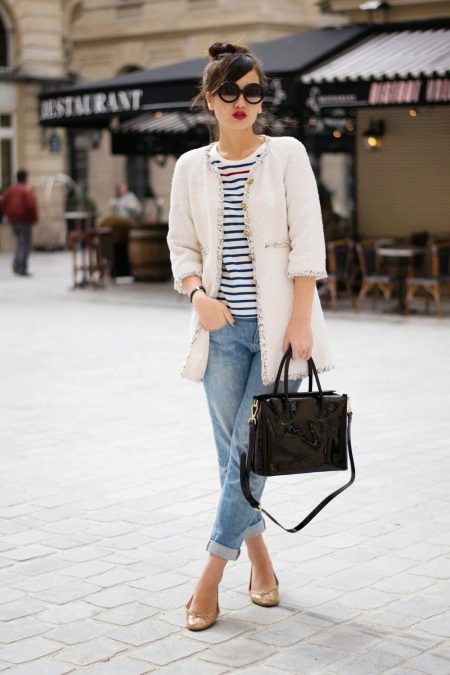 Kabát ve stylu Chanel je celkem všestranný. Hodí se to hubené a rovné džíny. Jako topy jsou vhodné halenky, košile, trička, svetry a další svetry.