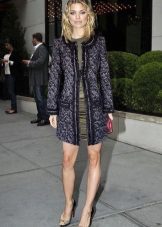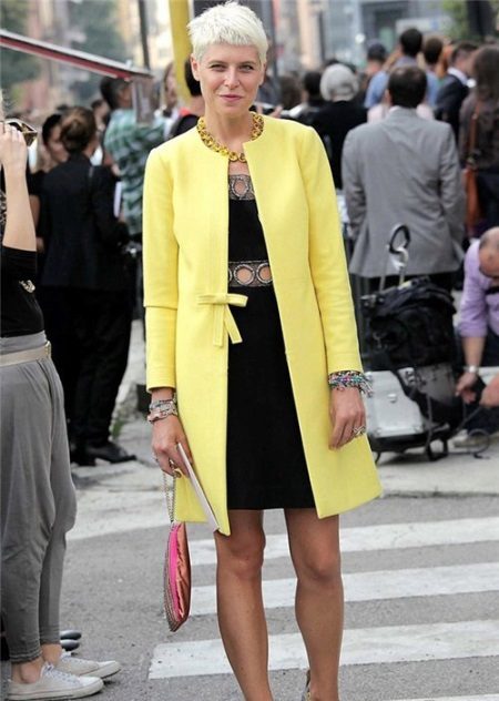 Kabát ve stylu Chanel je jednoduše navržen tak, aby vytvářel stylový a módní vzhled. Je to jednoduché, ale neuvěřitelně elegantní a univerzální. Krásný kabát z jemné žluté s černými šaty je špičkovým stylem a sofistikovaností. Zdá se, že jsou stvořeny jeden pro druhého. Díky jasnému příslušenství - náramky, kabelky a náhrdelníky se obraz stává nedílnou součástí.Boty musí být na vysokém podpatku.