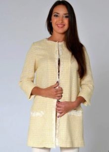- Lehký kabát. Vhodné pro pozdní léto a teplý pramen. Vypadá to jako klasický model, vyrobený pouze z lehké tkaniny. Existují dvě možnosti - až ke kolenu nebo do středu stehna.