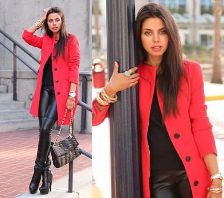 Zajímavý a zářivý pohled na podzim. Červený kabát doplňuje nenápadné dekorace. Kombinace červeného kabátu, černého svetru s černými legíny, vysokého podpatku a stylové kabelky činí obraz světlým a atraktivním.