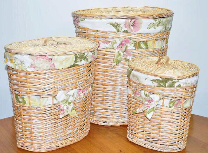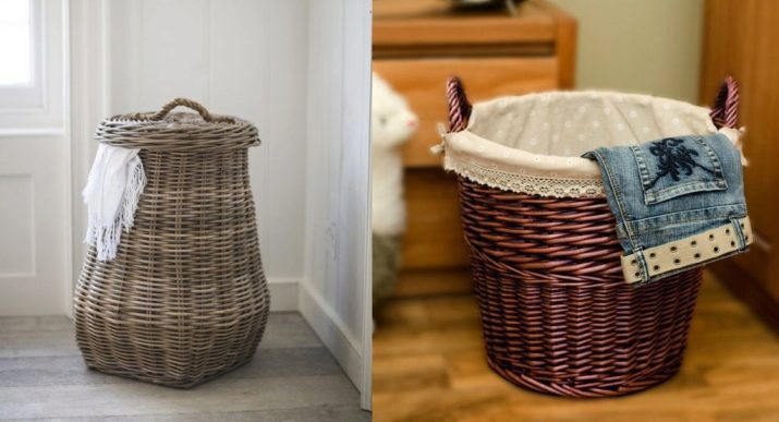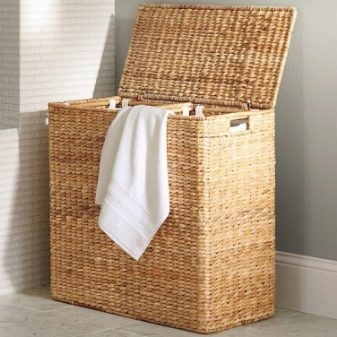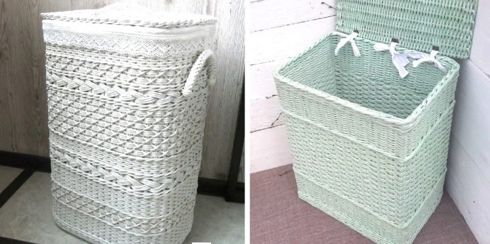 Pokud je koš vytvořen v jedné barvě a má klasický obdélníkový tvar, může stále vypadat velmi atraktivní. Vynikající ozdobou bude například zavěšené víko připevněné na saténové stuze, krajkové lemování nebo elegantní vzory získané změnou techniky tkaní.
