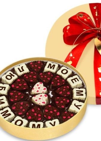 Pokud je váš muž skutečným znalcem chutné a voňavé čokolády, můžete si ji zakoupit neobvyklá sada čokolády. Na každé cukroví, která je vyrobena ve tvaru srdce, je malý nápis - vyznání lásky. Navíc si dnes můžete objednat ručně vyráběné čokolády. Výsledkem bude, že váš muž obdrží osobní krabičku se sladkostí takové chuti, kterou má rád. Mimochodem, na romantickou večeři si můžete předobjednat láhev šampaňského nebo vína.