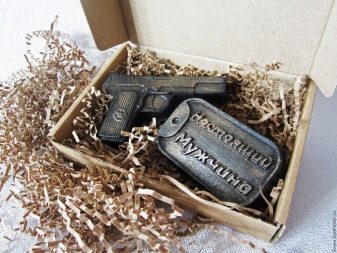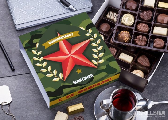 Candy box stylizované pro vojenské předměty. Stejně jako v případě milovaného člověka jsou sladkosti jako dárek 23. února ideální volbou. Přes „krutost“ mužů se upřímně radují z nadcházejícího čajového večírku s dobrými sladkostmi. Prezentujte kolegovi nebo příteli dobrou čokoládu nebo sladkosti - skvělá volba při výběru levných dárků ve velkém množství. Můžete si koupit čokoládové zbraně.