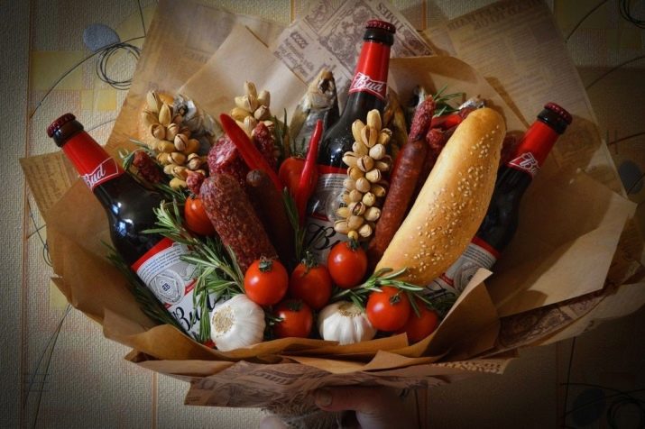 - Neobvyklé a voňavé dnes jsou velmi populární. jedlé kytice, které jsou určeny speciálně pro oslavy, jejichž viníky jsou kluci. Tyto kytice lze sbírat z ovoce, uzenin, sýrového talíře. Jedlé kombinace jsou často doplněny malými lahvemi alkoholu.