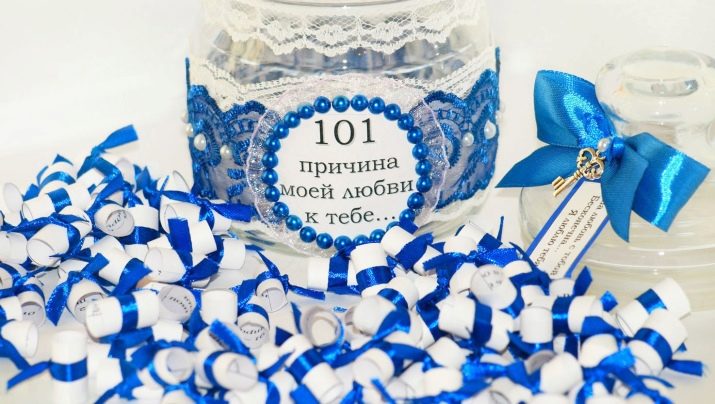 - Dojemný a sladký dárek - „100 důvodů pro lásku k vám.“ Je to krásná krabička s přiznáními od vaší přítelkyně. K vytvoření této kreativní prezentace nepotřebujete mnoho materiálů: stačí najít krásnou sklenici nebo krabici, vzít 100 malých listů a zapsat na každou z nich důvod, proč máte rádi svou vyvolenou. Listy jsou složeny do malých zkumavek, svázané stuhou krásných barev a vše vloženo do vybrané nádoby.