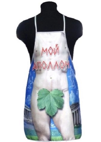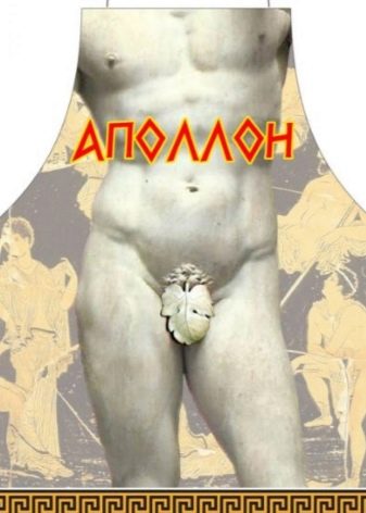 - Zástěra „Apollo“. Jedná se o obyčejnou kuchyňskou zástěru, pouze s potiskem, který z každé osoby oblečené v ní udělá slavnou starožitnou sochu.Bůh zobrazený sochařem se vyznačuje silným a poměrně krásným trupem, který dosud ne každý trenér má. A tak váš instruktor, připravující jídlo doma, může vypadat krásně a zároveň zábavně.