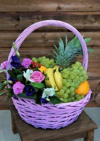 Vyplňte vybraný kontejner dárky podle vašeho přání: mohou to být buď klasické sladkosti, nebo více nestandardních možností. Například populární jsou koše s exotickým ovocem.