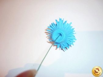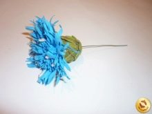 - Proveďte špičku drátu jako háček. Připevněte jej třásněmi. Na kov našroubujte žlutý proužek - to vytvoří jádro květu.