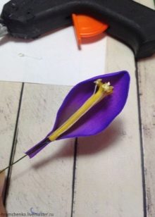 - Naviňte stonkový drát zelenou stuhou. Ze zeleného pěnového materiálu nařežte 2 proužky o šířce 2,5 cm a délce 13 cm. Přiveďte všechny součásti do železa, ohněte se. Takže šafránový list bude připraven.
