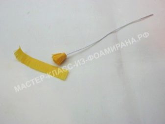 - Ze žlutého pěnového materiálu ořízněte obdélník o šířce 2 cm a délce 3,5 cm. Na jedné straně vytvořte třásně. Připojte žlutý proužek k drátu. 3 tyčinky by měly být nastaveny na 1 tlouček. Sbírejte pupen.