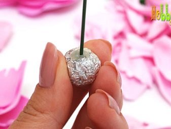 - Sbalte kuličky z fólie. V nich vytvořte díry, naplňte je horkým lepidlem, vložte hustý drát - to bude stonek.