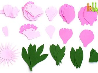 Z pěnového polyuretanu je možné vyrobit velmi krásné pivoňky. Nejprve by mistr měl připravit potřebné šablony, které budou v budoucnu potřebné k přípravě vzoru. Pomocí diagramu potřebných dílů načrtnutých nebo stažených z Internetu můžete vystřihnout všechny potřebné mezery.