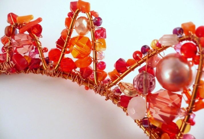 Na výrobě koruny - korálků s korálky je složitější postupná mistrovská třída. Jako základ musíte vzít zbytečný okraj. Samotný diadém se skládá z 15 prvků. Je lepší vzít rondelky. Uprostřed je na okraji upevněn kus drátu o průměru 0,3 mm. Dále na něj navlékneme 15 korálků, které se mohou měnit ve velikosti. Druhý konec je také připevněn k ráfku, měl by se získat druh kapky nebo oblouku. Dále navlékneme 11 drátů na drát, poté, co drát nejprve zavedeme do středu oblouku, vytvoříme oblouk z této části.