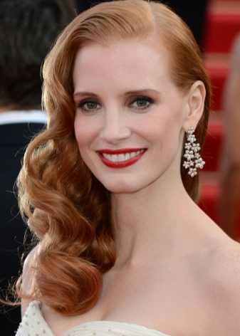 Nedbalost v takovém stylu je zakázána. Všechny kadeře opakují jeden zvlněný zámek, který padá na jedno rameno, a rozloučení na hlavě je ve většině případů provedeno šikmo.