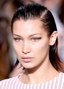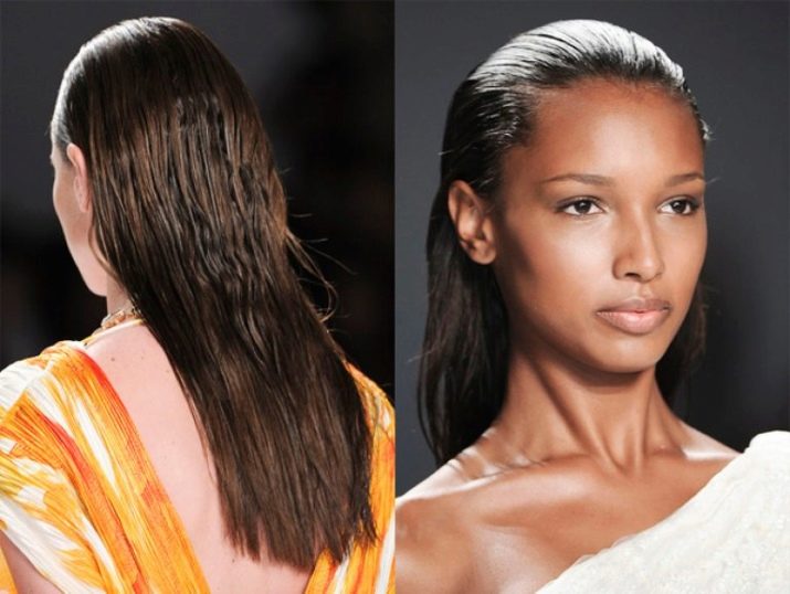 Na kudrnatých vlasech je mokré stylování snadné, bez ohledu na délku. V tomto případě vypadá výsledek přibližně stejně. S rovnými vlasy jsou věci jiné. Na dlouhých vlasech vypadají možnosti pro hladké účesy s gelovou aplikací pouze na horní část vlasů.
