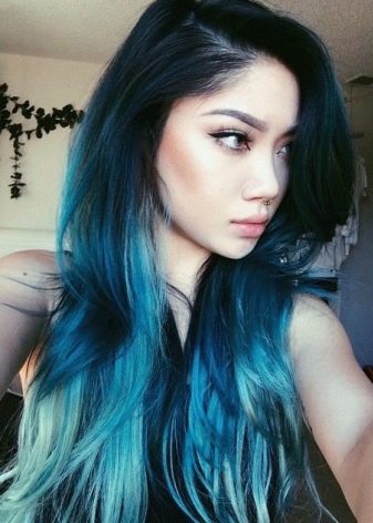 - Uhlí černé vlasy se světle hnědými vlasy může být protonován modře nebo fialově. Tato možnost barvení je velmi oblíbená u mladých dívek.