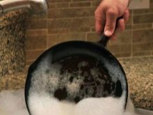Mimochodem, litinová pánev vyžaduje před prvním použitím řádnou přípravu. Tento postup je výhodnější provádět ve fázích, protože je k dispozici dostatek kroků. Nejprve musíte umýt zakoupená jídla solí, sódou a mýdlem na prádlo.