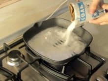 Po otření a vysušení fritézy se tato vloží na sporák a kalcinuje se při velkém ohni asi čtvrt hodiny. Poté, co usnul v nádrži kamenné soli, budete muset držet pánev nad ohněm na stejné množství. Poté je sůl důkladně očištěna suchým hadříkem a pekáč je zevnitř ošetřen rafinovaným olejem. Nakonec se pánev vyčistí uvnitř trouby a udržuje se půl hodiny při teplotě v rozmezí od 180 do 200 stupňů.