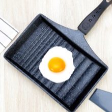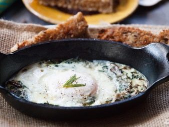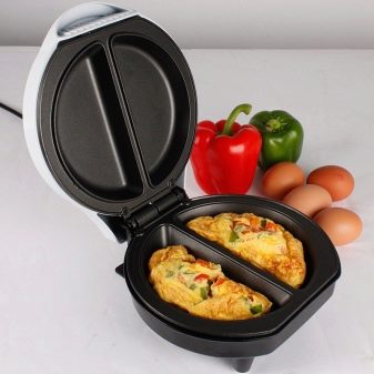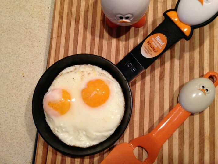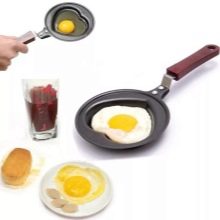 Speciální oboustranná pánev umožňuje vařit omeletu bez přemýšlení o otočení. Díky vhodnému designu lze vajíčko naplnit různými náplněmi, například šunkou nebo zelení.Některé modely jsou navíc vybaveny stojany, což vám umožní okamžitě vařit sázené vejce. Pokud mluvíme o základním nádobí pro vaření smažených vajec, pak je to obvykle malá velikost a kulatý tvar.