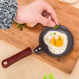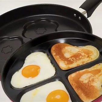 Spodní část takové pánve je tenká a strany jsou mírně svažité ke stranám. Pánev na vaření vaječných pokrmů je velmi často obvyklým designem palačinek. A pomocí porcovaných forem bude možné získat kudrnatá smažená vejce v běžné pánvi.
