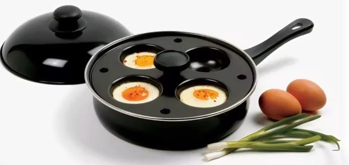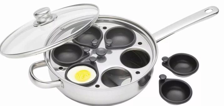 Nezapomeňte na to speciální "pánve na smažení" určené pro sázená vejce. Technika vaření vysvětluje poměrně složitou strukturu tohoto zařízení. Pánev se skládá z několika částí: hluboké pánve naplněné vodou, víko s otvorem, ze kterého přichází pára, formy na vejce a speciální horní disk. Druhá je zase „posetá“ s otvory - velká pro formy a menší pro odcházející páru.