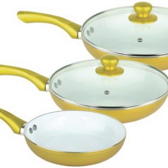 - Tloušťka stěn a dna nádobí. Odolnost keramického povlaku proti opotřebení a ochrana proti deformaci do značné míry závisí na těchto indikátorech. Je vhodné zakoupit nádobí na smažení s tloušťkou dna vyšší než 3 mm (pokud je základna hliník), 3,5 mm (litina) a 4 mm (ocel).