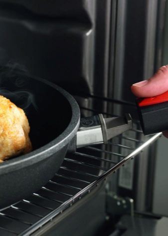 Pokud máte v plánu vařit pokrmy nejen na sporáku, ale také v troubě, pak Před nákupem nádobí musíte věnovat pozornost indikátorům, jako je schopnost odstranit kliky a úroveň tepelného odporu. Navíc pánve pro troubu musí mít ve svých konfiguračních vících, která odpovídají velikosti produktu. Ideální volbou jsou tepelně odolné skleněné kryty s pogumovaným nebo kovovým lemem. Také víčka by měla mít otvory pro únik páry, což zlepší chuť misky.