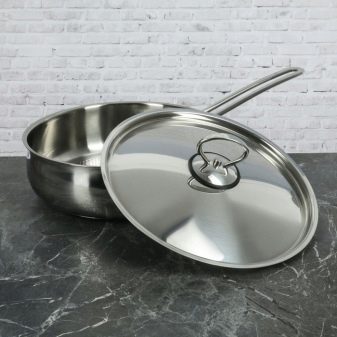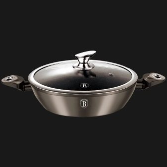 Nejoblíbenější možnost. Může být vybaven plastovou rukojetí nebo držákem z jiného materiálu. Toto je vhodný příklad, který vám umožní sledovat proces vaření pomocí průhledného povlaku.Výrobky pod ním kvalitativně mizí, to znamená, že v nádobě je pozorován teplotní režim vhodný pro tento proces.