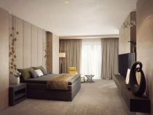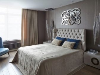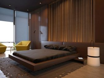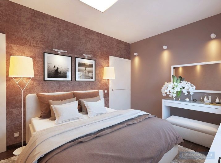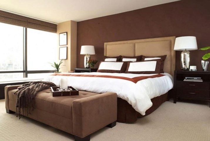 Ložnice v hnědých tónech je spojena s klidem a pohodlím. Je však lepší vyhnout se příliš tmavým barvám nebo je zředit pastelem. Jinak by se místnost mohla ukázat jako příliš pochmurná.