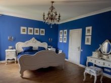Ložnice v klasické modré barvě. Hluboký stín podporuje relaxaci, uklidňuje se, je spojen s odpočinkem, spánkem. Samotná modrá je však příliš tmavá a hluboká, může vyvolat pocit temnoty, proto je zředěna modrou a bílou. Stejné kombinace (modrá a bílá) se opakují v textilu místnosti.