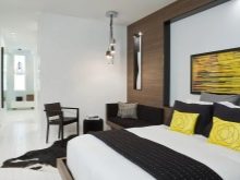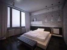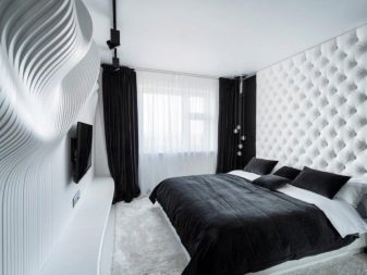 Příklad lakonického a originálního designu ložnice. Základní barvy jsou černá a bílá. Místnost je vyrobena ve stylu minimalismu, který je zdůrazněn pouze díky vybraným barvám. Díky měkkým stěnovým panelům a ušlechtilým materiálům nábytku se však v ložnici objevuje zvláštní luxus, lze říci aristokratickou jednoduchost.