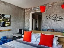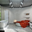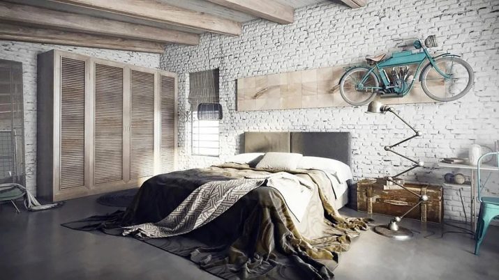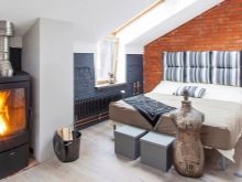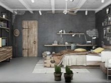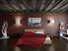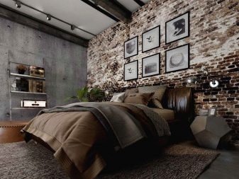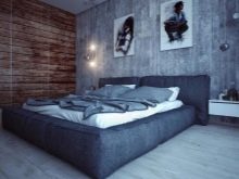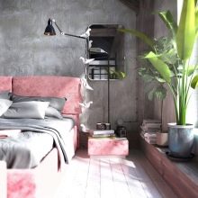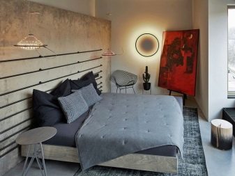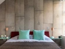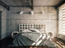 Svislé povrchy ložnice v podkroví mohou být pokryty hrubým štukem nebo barvou, jakož i kovovými panely. Pokud jde o beton, měl by to být více v designu místnosti než jiné dokončovací materiály. Současně jej lze použít jak pro stěny a stropy, tak i pro obklady podlah. Beton je ve vynikajícím kontrastu s kovem, který se také používá při dekoraci průmyslových zařízení.