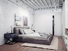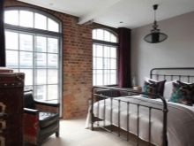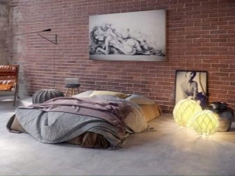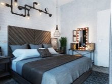 Jako pomocné osvětlení v takové ložnici lze použít nejběžnější žárovky bez stínů. Pokud chcete něco jedinečného, můžete se podívat na výrobky pouličního typu: reflektory i běžné pouliční osvětlení. V takovém interiéru se stanou ozdobou stylu. Neočekávaným řešením může být možnost svítidla se stínidlem drátu nebo sběrnicového systému.