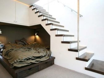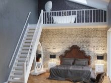 Cool bude vypadat v ložnici ve stylu podkroví a skleněných blocích. Pod spícím ostrovem můžete také přidělit prostor pod stropem (v rozvrženích se dvěma úrovněmi prostor). Někdo rád využívá prostor pod schody pod ložnicí. Pokud jde o výběr a uspořádání zbývajících prvků nábytku, zde bude vše záviset na velikosti místnosti a preferencích zákazníka.