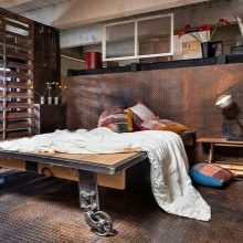 Praktičnost ložnice v podkroví je dosažena vzájemně výhodnou kombinací minimalismu s průmyslovým stylem. Při nákupu nábytkových prvků je třeba věnovat zvláštní pozornost klíčovému kusu nábytku - postelím. Bude středem vnitřní kompozice, a proto by se měl stát jakýmsi předmětem ART. Aby se dosáhlo požadovaného účinku, postele mohou být vytvořeny vlastní platformou nebo pro ně postavit čelní panel kreativního typu.