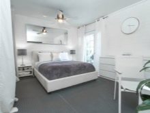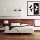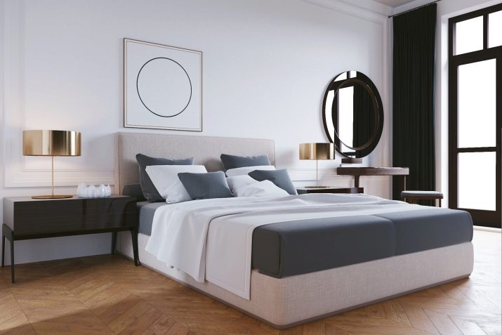 Stačí zavěsit zrcadla, několik rámečků šedé barvy, stojací lampu a noční lampičky - připravena je jednoduchá a výstižná místnost v moderním stylu.