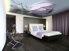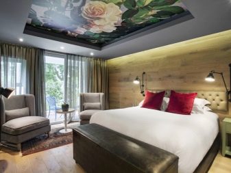 Doplňte strop a změkčete rohy umožní štuk a štuk. Relevantní je štukování ve formě listů a podobných rostlinných motivů, vzorů a obrazů. Ozdoba, kresby a vzory květin, motýlů nebo peří dokonale zapadají do tohoto stylu. Pro stream můžete použít bílé PVC nebo textilie, na které bude výkres nebo vzor vytištěn.