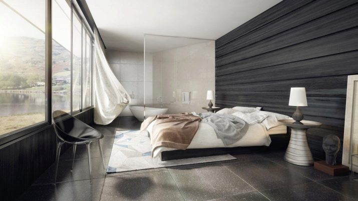 Pro složitější konstrukční řešení můžete stěny obložit tmavě šedou mramorovou barvou. Parkety jsou položeny texturou a jedna zeď je zvýrazněna fotografickou tapetou nebo kontrastní barvou.