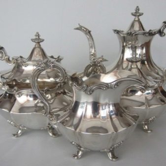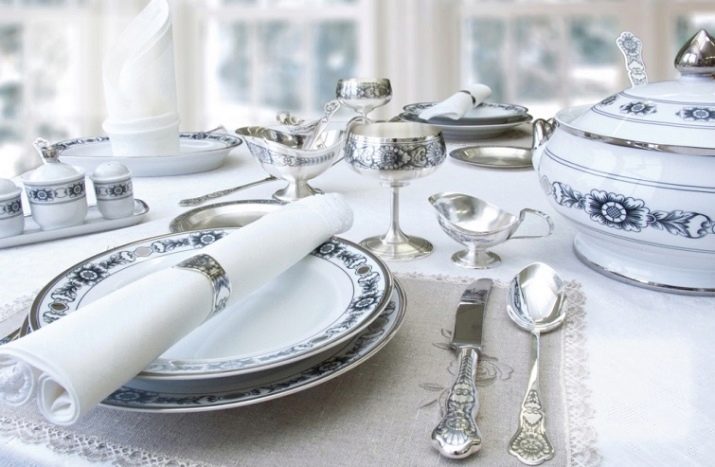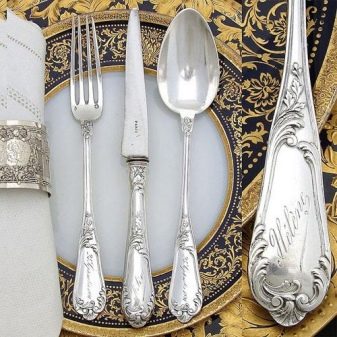 Ve středověku a později byly nádobí vyrobeny z čistého kovu, ale nyní jsou vyrobeny ze stříbra 925 nebo 800. Tento digitální znak ukazuje procento čistého stříbra ve slitině. Moderní porce zřídka zahrnují samovary nebo stříbrné podnosy, ale lžíce, nože, vidličky se získávají poměrně často. Příbory se vytvářejí podle náčrtků na zařízení pro lisování. Nejprve se střílí na požadovanou tloušťku a dokonale hladký povrch. Poté se servírovací předměty vyrazí lisem, v této fázi se objeví plánovaná ozdoba.