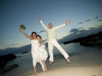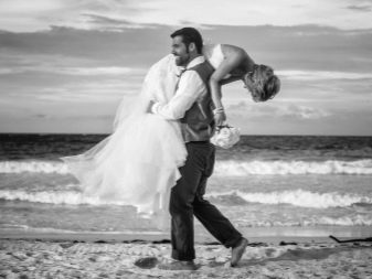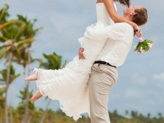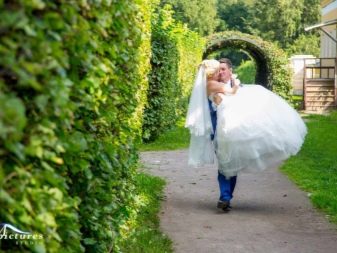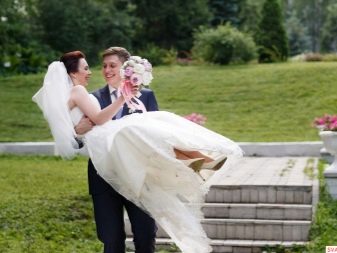 - na ruce - klasický výstřel, když nově vyrobený manžel nese svou ženu v náručí, ale v tomto případě je třeba vzít v úvahu rysy výstroje nevěsty; je-li šaty velmi bujné, bude vhodná klasická podpora, když je jedno z mladých paží ovinuto kolem pasu jeho partnera a druhý ji drží pod koleny, je-li šaty vyrobeny ve stylu mořské panny nebo mírně přiléhající siluety, má smysl dívku zvednout vzpřímeně.