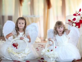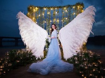 - Nimbusová a andělská křídla. Jedná se o velmi atmosférický doplněk. Obvykle se pro obrázky používají velká a velmi objemná křídla, která se vyrábějí pomocí skutečného peří nebo z umělých analogů. Takový stylový doplněk nevěstiných šatů z ní udělá skutečného nebeského posla a rámy budou vypadat dobře kdekoli a za každého počasí. Společnost může dělat křídla s květinami ve vlasech, jemným make-upem a šaty vyvíjejícími se ve větru. Nejlepší je provádět takové fotografie v přírodě a také harmonicky dívat na svatby v pohádkovém stylu. V závislosti na obecném designu manžela se může proměnit v vílu, elfa nebo dobrého anděla.