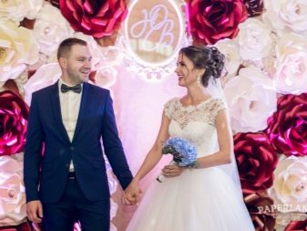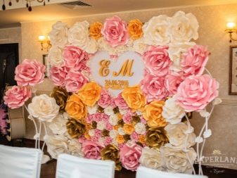 - Velké květiny. Papírové květiny představují skutečnou harmonii a sofistikovanost. Obvykle stínují stylové oblečení nevěsty a ženicha a jsou symbolem věčné mládí. V případě potřeby můžete vytvořit několik barev a ozdobit je celou fotografickou zónou.