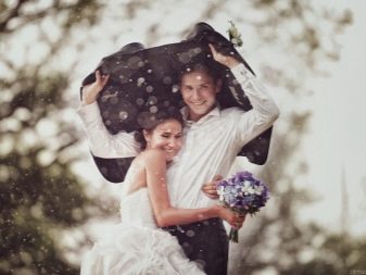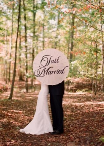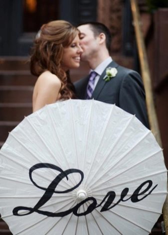- Deštník Jedním z nejnovějších trendů se staly obrazy, na kterých pár drží neobvyklé deštníky, ručně malované. Současně jsou nápisy obvykle vytvářeny osobní, aby mohly odrážet pocity nevěsty a ženicha navzájem, jejich přísahy a sliby.