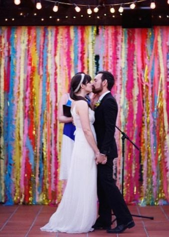 - Pozadí z papíru. Můžete si vytvořit stylový svatební fotophone z běžného krepového papíru. To se děje ve formě stuh a kombinuje se do jakési záclony. Typicky jsou takové kompozice vyráběny různobarevně, v tomto případě harmonicky zdůrazňují celkovou atmosféru dovolené.