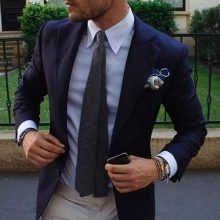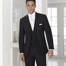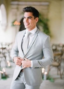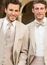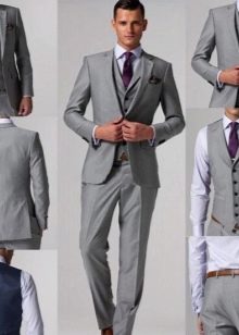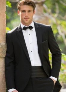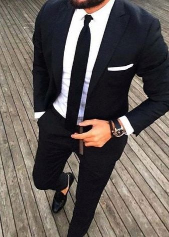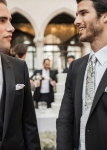 Takový oblek vypadá přímo v atmosféře prestižní restaurace, na recepci na počest svatby, na úřední registraci s velkým počtem hostů. Je však lepší odmítnout černou ve prospěch tmavě šedé, indigové nebo chameleonové tkaniny. Textura je vybrána podle přání: hladká, lesklá, žebrovaná nebo pruhovaná a další. Pokud chcete být v trendu, tmavý oblek a košile s nízkým klíčem jsou o několik odstínů světlejší. Ale i když je svatba oficiální událostí, neměli byste ji brát příliš vážně, abyste nevypadali příliš nudně a šedě.