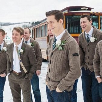 Pohodlný svetr s košili může také udělat obrázek městských chlápků na svatbě, která nevyžaduje přísný oblékání. Pánská bunda takového střihu je vhodná pro kalhoty jakéhokoli stylu. Sada se bude zdát pohodlná pro všechny, kteří dávají přednost neformálnímu stylu podnikání.