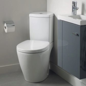Tyto kopie mají poměrně dostupnou cenu a velmi dobrý výkon. Jejich instalace je jednoduchá. Upevnění se provádí pomocí kotevních šroubů a instalace trvá trochu času. Kromě toho může tuto práci vykonat kdokoli, kdo má alespoň některé dovednosti. Kompaktní výrobky jsou instalovány ve velkých i malých místnostech. Tento design se snadno opravuje a umožní jeho provedení bez poškození podlahy. Toalety na podlahu s jednodílnou policí (nádrž je namontována na polici) mohou mít takové standardní velikosti: 60,5x34-36x37-40 cm. Toaletu bez jednodílné police tvoří následující indikátory: 33-46x34-36x37-40 cm.