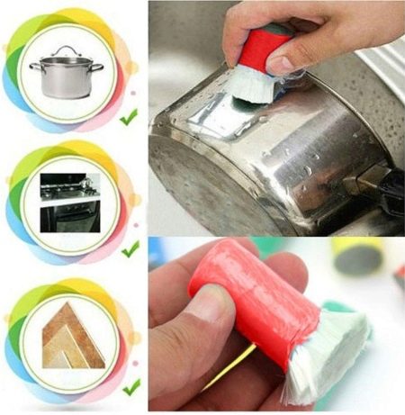 - škrabky, tvrdé kartáče, kovové houby - je lepší je odmítnout. Pomáhají samozřejmě rychle a účinně se zbavit vážných nečistot na nádobí, ale zároveň zanechají škrábance na povrchu kuchyňského náčiní;